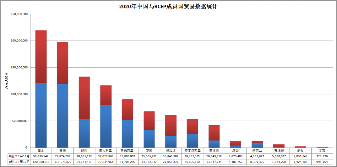 2020年, RCEP成員國中的東盟10國已超越歐盟成為我國第一大貿(mào)易伙伴,進出口值4.74萬億元人民幣,增長7%。其中,單對越南的進出口高達1.33萬億人民幣, 增長18.8%;日本、韓國分別為我國第四和第五大貿(mào)易伙伴,進出口值分別為2.2萬億元人民幣、1.97萬億元人民幣,分別增長1.2%和0.7%; 對澳大利亞進出口1.17萬億元人民幣,下降0.1%;對新西蘭進出口0.13萬億元人民幣,下降0.4%。